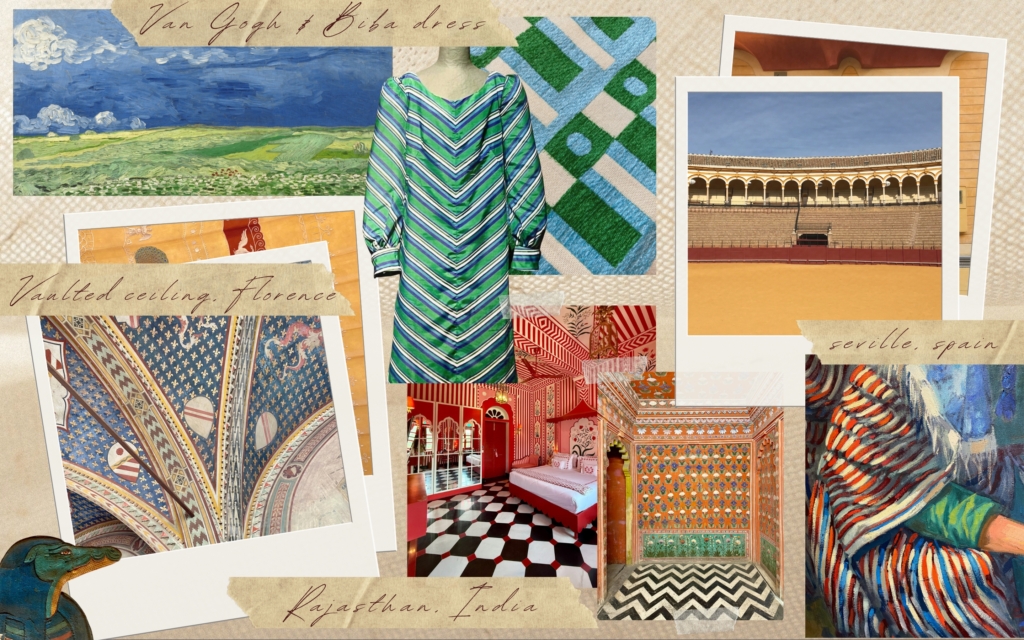 One palette in particular grew from a series of visual references that had been quietly sitting in my archive for years. A Biba dress I once saw at The Fashion and Textile Museum provided the starting point, its rich colours and bold geometric chevron possessing that particular seventies glamour that feels both decadent and surprisingly soft. Alongside it I kept returning to a small fragment of antique silk I have long treasured, its tones mellowed by time. And then, inevitably, there were the paintings of Van Gogh, where colour is never static but seems to vibrate with life. What interested me most was how these references, drawn from fashion, art and the natural world, shared a similar sense of depth and movement. Translating that feeling into woven stripes became an exercise in balance, layering colour so that the palette felt complex yet harmonious when viewed across the fabric.